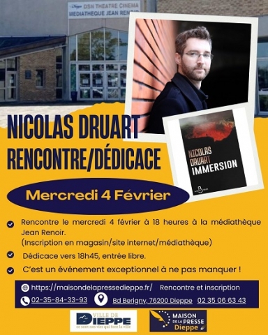 La Médiathèque Jean-Renoir aura le plaisir d'accueillir Nicolas Druart pour une rencontre avec son public et une séance de dédicace le mercredi 4 février à partir de 18 heures. Cette manifestation est possible grâce à un partenariat avec la Maison de la Presse qui organise sa venue.